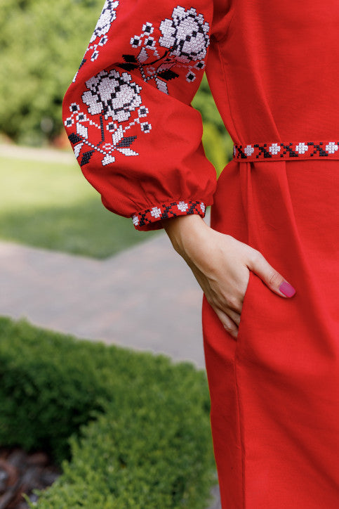 WOMEN'S LIEN EMBROIDERED RED DRESS WITH POCKETS "CVIT TROANDU"/UKRAINIAN VYSHYVANKA IN USA
